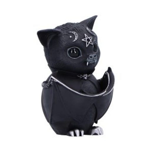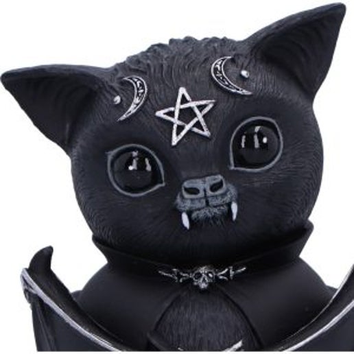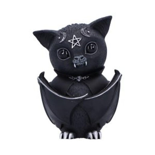 This strange creature is the union of good and evil. As you look into its black eyes you notice that all is not as it seems, darkness resides within. Inside of this bat appears to be a vampire spirit, encapsulated with abnormally large fangs and a black cape. The bat is decorated in ornate silver detailing and satanic symbology. Cast in high-quality resin and carefully hand-painted, this figurine is likely to be the cutest occultist you’ve ever seen!