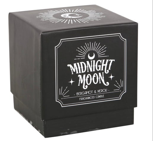Indulge your senses with an enchanting blend of darkness and allure with this Midnight Moon fragranced candle. Infused with the captivating scent of bergamot and neroli orange, its bewitching aroma will put you under its spell. Packaged in a matching sliding box that's great for gifting and shop displays. Approximately 21 hours burn time. Designed by Something Different and part of the 'Midnight Rituals' range of gothic home fragrance gifts.